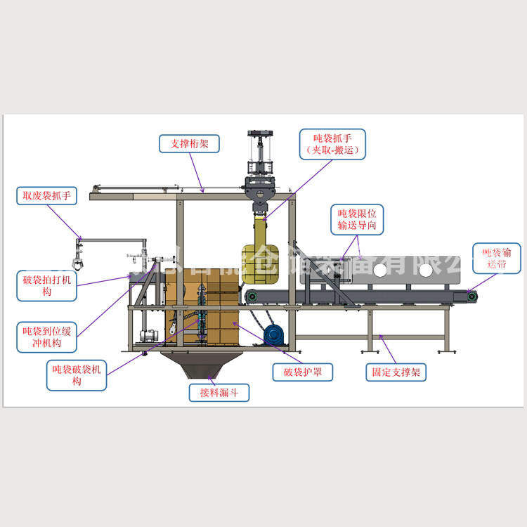 化工粉智能噸袋拆包機主要用于500-2500KG噸袋物料的連續(xù)拆包,實現(xiàn)噸袋輸送、全自動拆包、廢袋自動打包等自動化生產(chǎn)線的智能拆包,它自動化程度高、拆包速度快,無需人工參與,就能是噸袋自動輸送、拆包、廢袋轉(zhuǎn)移;一鍵啟停,觸屏顯示、視覺監(jiān)控、自動計數(shù)、保養(yǎng)提示、一鍵潤滑、故障報警、環(huán)境溫度濕度空氣質(zhì)量檢測等功能,因此受到企業(yè)的好評。