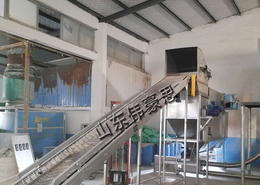 滑石粉通過皮帶輸送機或者其他方式,將物料輸送到自動拆包機里面,經(jīng)過割刀的割袋破袋,開始將物料從袋子分離。滑石粉自動拆包機是一個密閉的拆包環(huán)境,這樣無論再細再輕的物料,都不會出現(xiàn)揚塵飛揚,從而阻斷了揚塵對環(huán)境的污染。袋子經(jīng)過割刀割破后,內部經(jīng)過滾筒篩的篩分,實現(xiàn)袋料分離。后經(jīng)過廢袋收集裝置,把袋子單獨收集,物料從另一個出口出來,鏈接管鏈輸送機,繼續(xù)下一步的工藝流程。