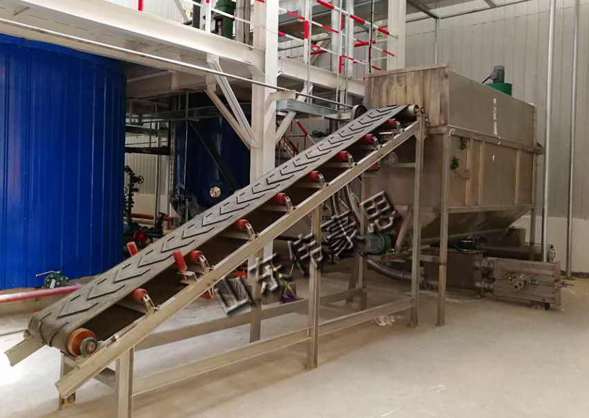 袋料由皮帶輸送機傳送至45度角的滑板上并依靠重力沿滑板下滑,在下滑過程中由快速轉動的刀片將包裝袋割開,被割開的殘袋和物料滑入滾筒篩進行篩分。從滾筒篩落下的物料由螺旋輸送機輸出,破損的包裝袋、雜質、結塊物料被滾筒篩帶出機體。割刀破袋過程中引起的粉塵由布袋式除塵器捕捉并抖落入螺旋輸送機(由螺旋輸送機輸出的物料可采用我公司設計制造的密相氣力輸送裝置或稀相氣力輸送裝置,輸送至物料儲罐中)。