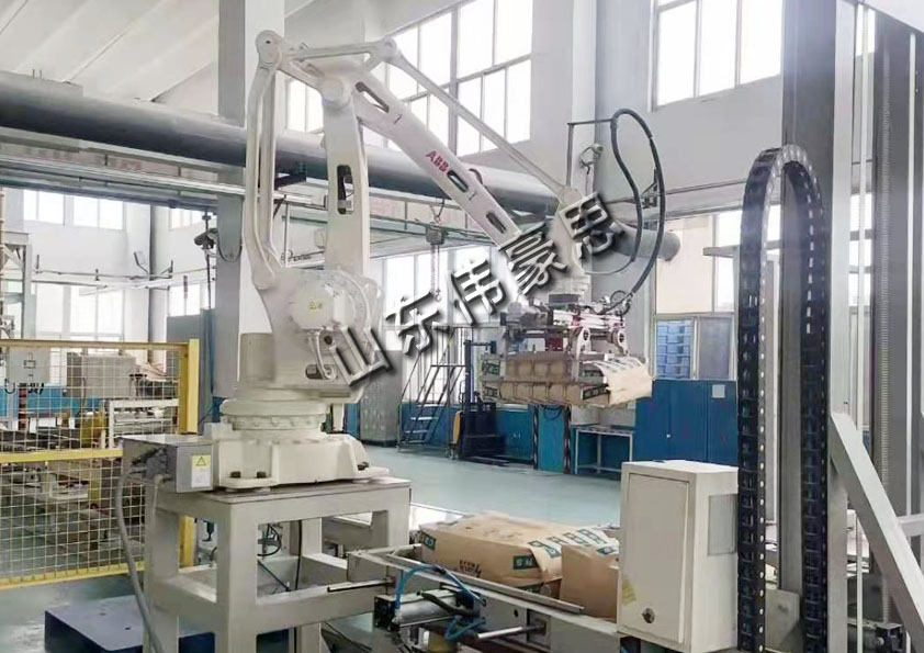 將包裝好的物料通過輸送機(jī)送至碼垛制定區(qū)定位,機(jī)械手碼垛機(jī)通過各軸配合,將夾具運(yùn)行至物料定位的正上方,當(dāng)物料定位信號(hào)發(fā)出時(shí),夾具通過伺服電機(jī)控制運(yùn)動(dòng)向下運(yùn)動(dòng),達(dá)到夾具夾持物料高度時(shí),夾具開啟,夾起物料,升到一定高度后,通過客戶預(yù)設(shè)程序?qū)⑽锪纤椭链a垛位上方,使物料到達(dá)放置點(diǎn),此時(shí)夾具打開,將物料碼入制定位置,重復(fù)以上動(dòng)作,把整拖碼垛完以后,蜂鳴器運(yùn)行,提醒已經(jīng)碼垛完成。叉車將碼垛好的托盤運(yùn)走,放入新的托盤,重新往復(fù)動(dòng)作即可。