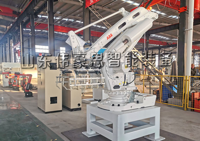 3、鉀肥碼垛機器人通過機械手吸盤將箱子或者其它碼垛的物品整體垂直提升,在水平運行,以躲避通道,寬度和高度按要求設定,經過通道后垂直放置在碼跺區(qū),前面的定位擋板已經將箱體旋轉,所以機械手不需要旋轉,在放置完成后,按照原路徑返回,碼跺區(qū)完成碼跺后,由叉車將其叉走,在放置空閑碼盤。