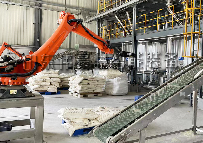 礦鹽自動(dòng)拆袋機(jī)械手的工作原理:由自動(dòng)拆垛機(jī)將料袋進(jìn)行上袋,通過(guò)上袋輸送機(jī)自動(dòng)將袋裝粉粒物料傳送到45度角的滑板上,并依靠料料袋其重力沿滑板下滑,在下滑過(guò)程中由快速旋轉(zhuǎn)的刀片將包裝袋割開(kāi),被割開(kāi)的殘袋和物料滑入物袋分離器進(jìn)行篩分。從物袋分離器分離出來(lái)的物料由物料收集器收集并通過(guò)斗式提高機(jī)輸出到儲(chǔ)存器內(nèi)(也可用密相氣力輸送裝置或稀相氣力輸送裝置,輸送到物料儲(chǔ)罐中)。物袋分離器分離出的破損包裝袋、雜質(zhì)、結(jié)塊物料被輸送出去。割刀拆袋的過(guò)程中引起的粉塵由布袋式除塵器捕捉并抖落入物料收集。作業(yè)中產(chǎn)生的粉塵被設(shè)備自帶的除塵裝置過(guò)濾凈化,不會(huì)污染環(huán)境,又能使工廠工作工人能在清潔的環(huán)境中連續(xù)工作