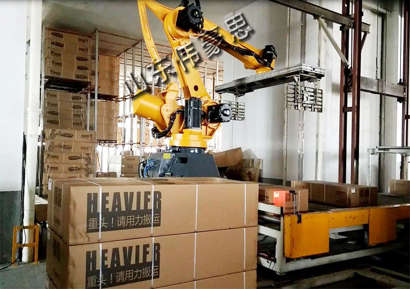 碼垛機(jī)器人整個系統(tǒng)由機(jī)器人系統(tǒng)、碼垛平臺等組成,完成成品箱子的碼垛工作。先由傳送帶把成品箱子輸送至搬運(yùn)工位,通過安裝在機(jī)器人上的專用抓具,快速準(zhǔn)確的抓取箱子,按照設(shè)定好的程序,把單個箱子碼放在相應(yīng)工位,再由人工輔助下由叉車搬運(yùn)至成品托盤存放工位。