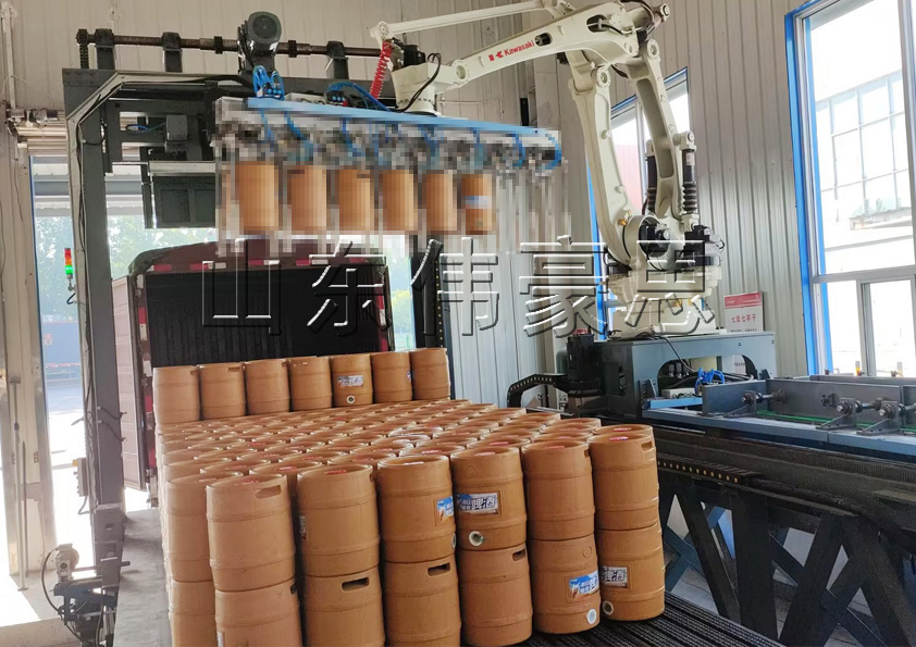 山東偉豪思(15314426573 殷)啤酒桶推進式裝車機是可以把桶裝啤酒桶整齊的碼垛到托盤上,再整體推進車廂的自動化裝車設備,它被廣泛應用于啤酒生產線中,可以提高生產效率和生產質量,它是一機多用的裝車設備,能給桶料、袋料、箱料實現自動裝車,還能自動裝箱式車、高欄車、平板車等車型,實現一機多用,減少設備投入。