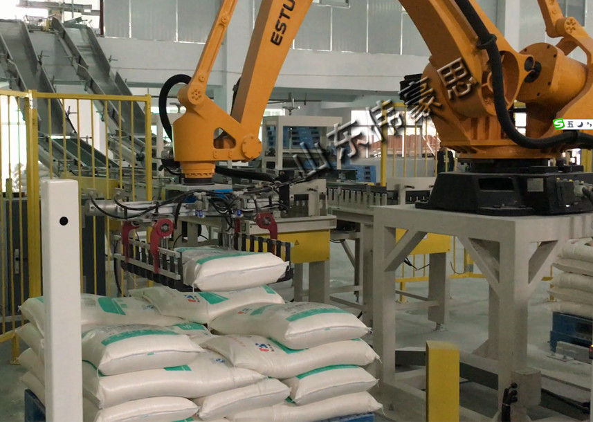 5、抓袋碼垛機(jī)構(gòu)。采用機(jī)器人碼垛機(jī)構(gòu)完成碼垛作業(yè)。