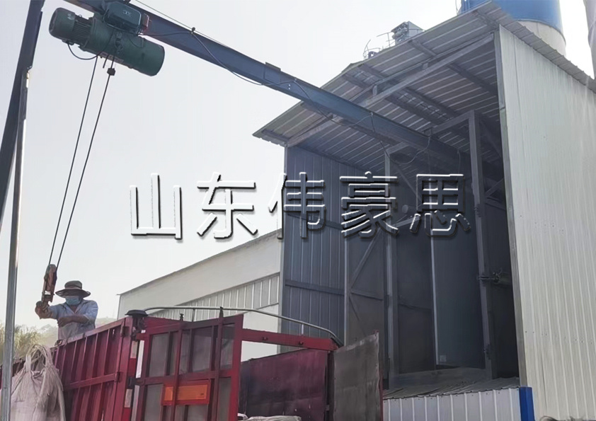 人工把噸袋掛在吊葫蘆上,然后吊葫蘆升起,把噸袋吊起,然后在噸袋下滑過程中人工拆開噸袋口(噸袋需要回收再次利用的)或者直接用噸袋自帶的十字割刀(選配)割破,這樣物料靠自身的重力落進(jìn)儲(chǔ)斗中來完成卸料工作。這樣不僅在拆包的過程中減輕了勞動(dòng)者的工作強(qiáng)度,更是解決了噸袋在開袋過程中出現(xiàn)因吸潮導(dǎo)致結(jié)塊搭橋不易出料的現(xiàn)象.