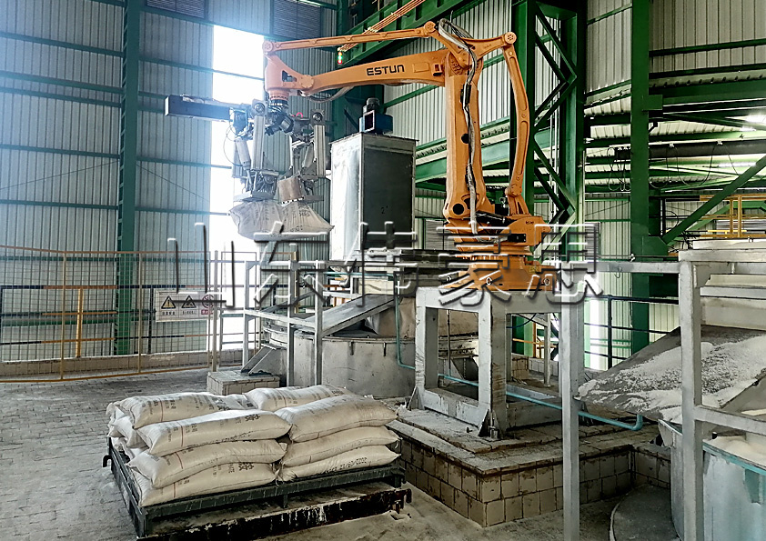 袋料由機(jī)器人拆垛機(jī)將袋料抓取提升至割袋裝置上方,由割袋裝置拆袋,物料落入儲(chǔ)料罐內(nèi),機(jī)械抓手通過(guò)抖動(dòng)清空料袋將廢袋放入收集箱內(nèi),整個(gè)操作過(guò)程無(wú)需人工參與,真正實(shí)現(xiàn)自動(dòng)化減人目標(biāo),這套自動(dòng)拆袋機(jī)器人可應(yīng)用于化工、建材、飼料、肥料、糧食、塑料等多行業(yè).